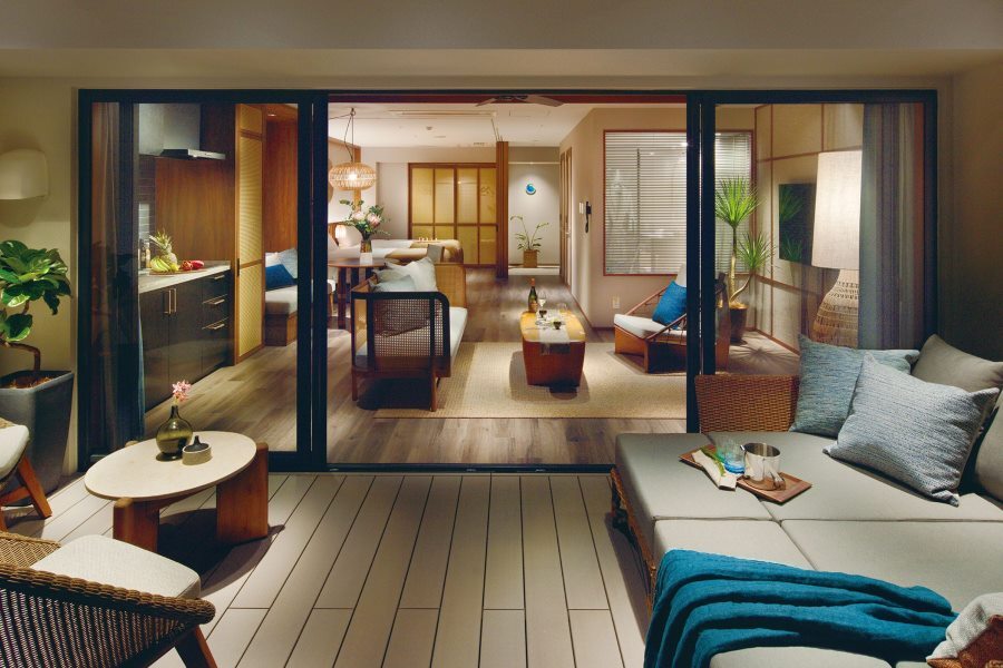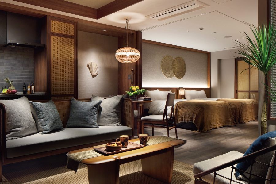 南国リゾートのように濃色の木や淡色の麻など使った自然に近いしつらえに加えて、沖縄のモルタル塗りをイメージしたテクスチャ感ある明るい色のコーディネート。