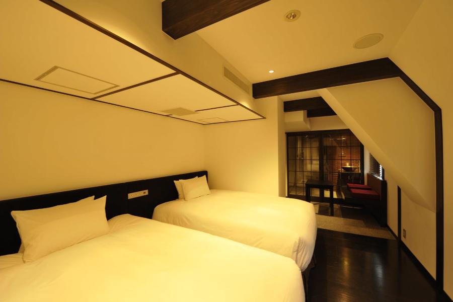 “古民家(Kominka) ” 伝統な日本建築を受け継ぐ家屋の風合いを再現した部屋。 天井に木材を使ったり、くつろぎの縁側スペースもつくりました。 ●広さ 27㎡ ●ベッドサイズ 140cm×203cm 2台 英国王室御用達の栄誉を受けた、英国スランバーランド社製の最高峰「グランドスイート」を全客室のベッドに採用。「上質な眠り」をお約束します。 ●Free Wi-Fi完備 ●お洒落なガラス張りのシャワールーム(バスタブなし)。 ●フリーミネラルウオーターサービス