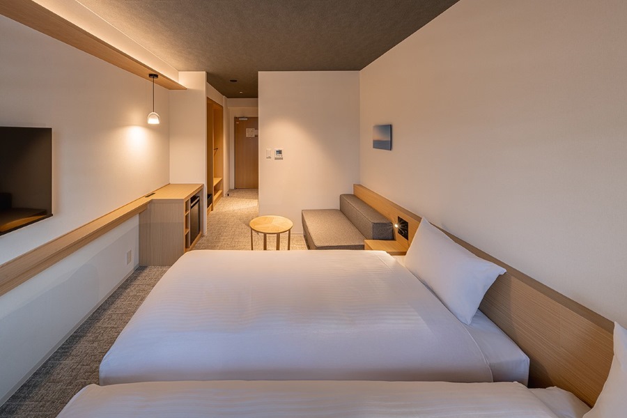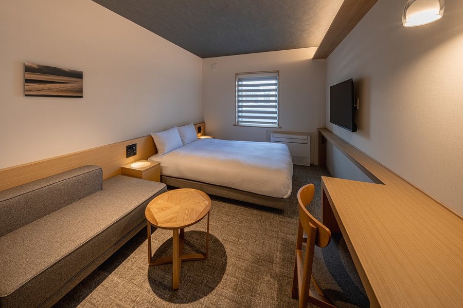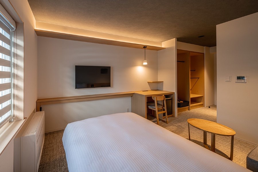 幅の広いベッドとソファのほかにワーキングデスクも備えており、ビジネス利用にも向いています。