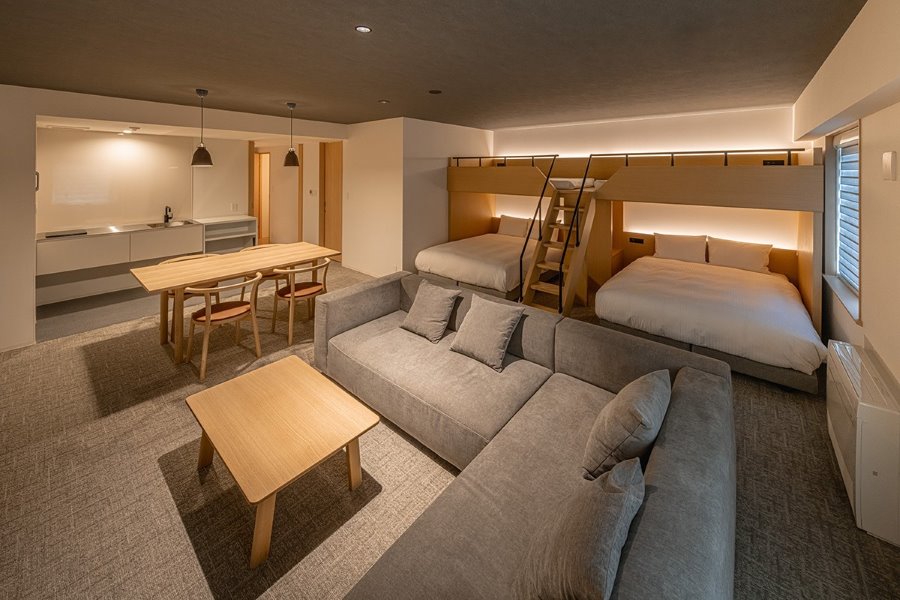 ミニキッチンやダイニングテーブル、ソファセットを備え、お家にいるように快適にお過ごしいただける広いお部屋です。幅広のダブルベッドやロフトベッドが各2台あり、最大6名さまでご利用いただけます。