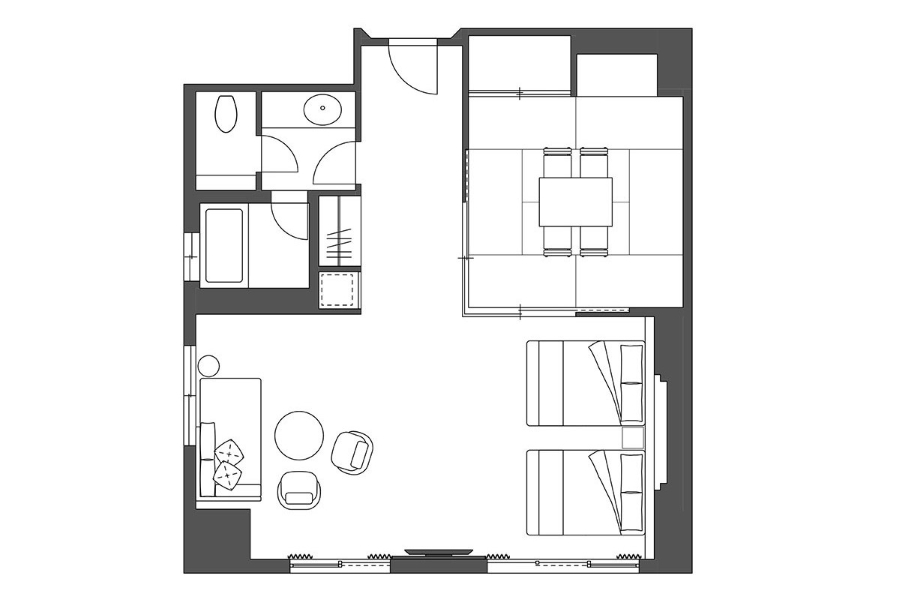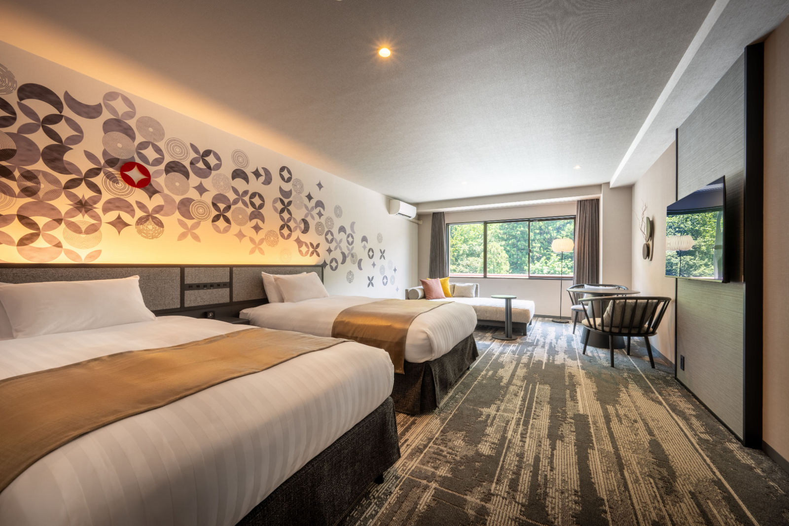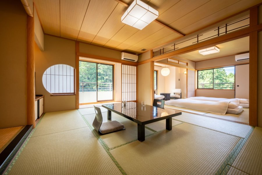 渓谷の自然が織りなす景色と、洗練された和モダンな空間を心ゆくまでお楽しみください。エキストラベッドを2台入れ、最大4名様までお泊りいただけます。
