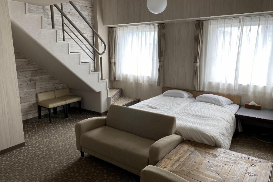 2017年6月21日にリニューアル完了!全室禁煙! 英国王室御用達のスランバーランドベッド採用!快適な眠りと目覚めをご提供します! お部屋の広さ59.5㎡・ダブルベッド(140cm幅)が2台の2Fベッドルームと 1Fリビングルームに分かれた明るくて快適な客室! ※最大4名様利用可 ※3名様以上はエキストラベッド(100cm)の対応となります。 メゾネットタイプ!ご家族や仲間同士の利用に最適です。 ◇全室蛍光照明完備で明るく、デスクワークも快適◇ 【客室設備】 ●無線Wi-Fi ●無料テレビ ●ユニットバス ●洗浄器付トイレ ●ドライヤー ●電気ケトル ●バスタオル・フェイスタオル ●ボディスポンジ ●歯ブラシ・カミソリ ●消臭スプレー ●スリッパ ●パジャマ(お子様用はフロントへお尋ねください) プラスチック削減の為、一部アメニティはフロントアメニティコーナーよりお持ちください。