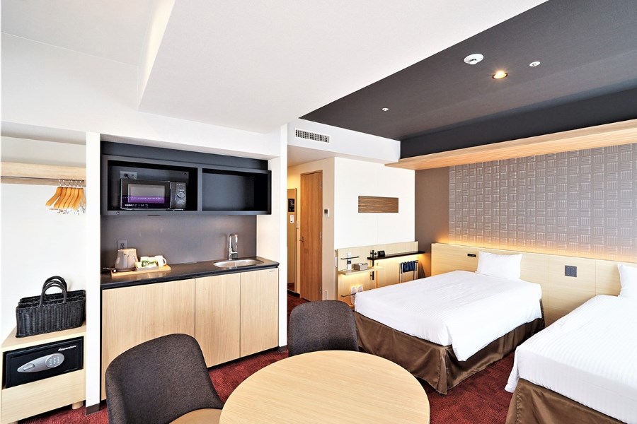 30~33平米のゆとりある空間に、1100mm幅のベッドを2台配したツインルームです。 ミニキッチン(コンロなし)や、洗い場・バスタブ付のバスルームを備え、長期滞在にもおすすめです。
