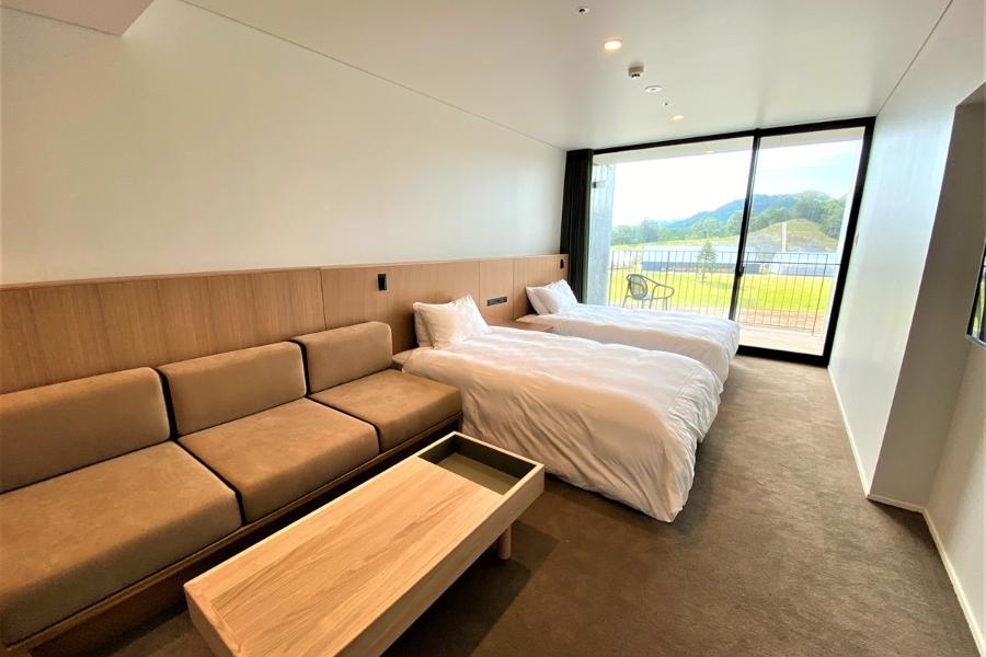 客室と同様の広さのテラスを設けた客室。半露天のバスルームの窓は開けることができます。 セミダブルサイズのベッドが2つありお部屋の広さ 40.1㎡。 バスルーム・トイレ・洗面台の各水廻りをそれぞれ別に設置した3点独立型を導入しております。 ※テラス及び、客室内外での火器の使用はご遠慮ください。 ※大人3人以上でご宿泊される場合はソファベッドのご利用となります。
