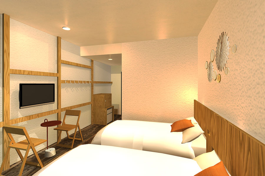 シモンズ製2段ベッド(上:シングル/下:ダブル)の客室。[広さ:15.59平米]