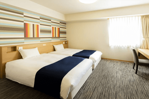 札幌国際スキー場へ行くバス停はホテルの目の前!(要予約)客室はカップルや夫婦におすすめダブル・ツイン、ファミリー利用に人気の定員4名まで利用できる2段ベッドタイプまで豊富な設定あり!宿泊者限定のドリンク・おつまみ等を楽しめるラウンジが30分無料♪