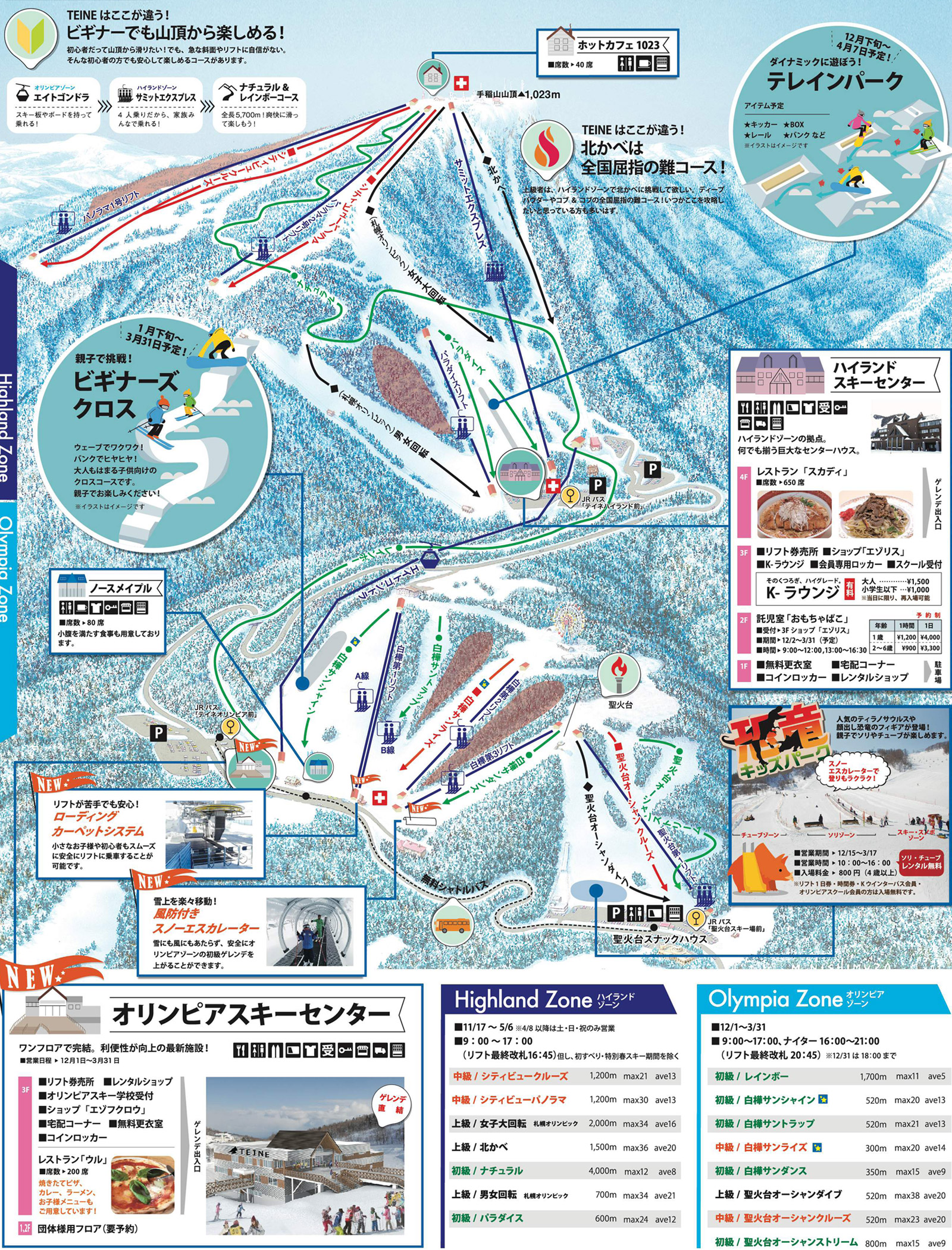 全15コース(最長滑走距離:6,000m(ナチュラルコース+レインボーコース)、最大斜度:38度(オリンピアゾーン聖火台 オーシャンダイブ上部))圧雪率