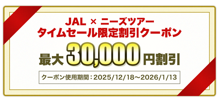 ニーズツアー会員限定の割引クーポンです。クーポンを利用する場合、予めニーズツアー会員のログイン(または新規登録)が必要です。ログインされていない場合、ツアー予約時に割引クーポンのコード入力欄が表示されませんのでご注意ください。